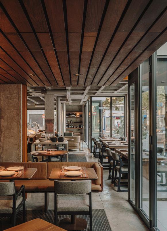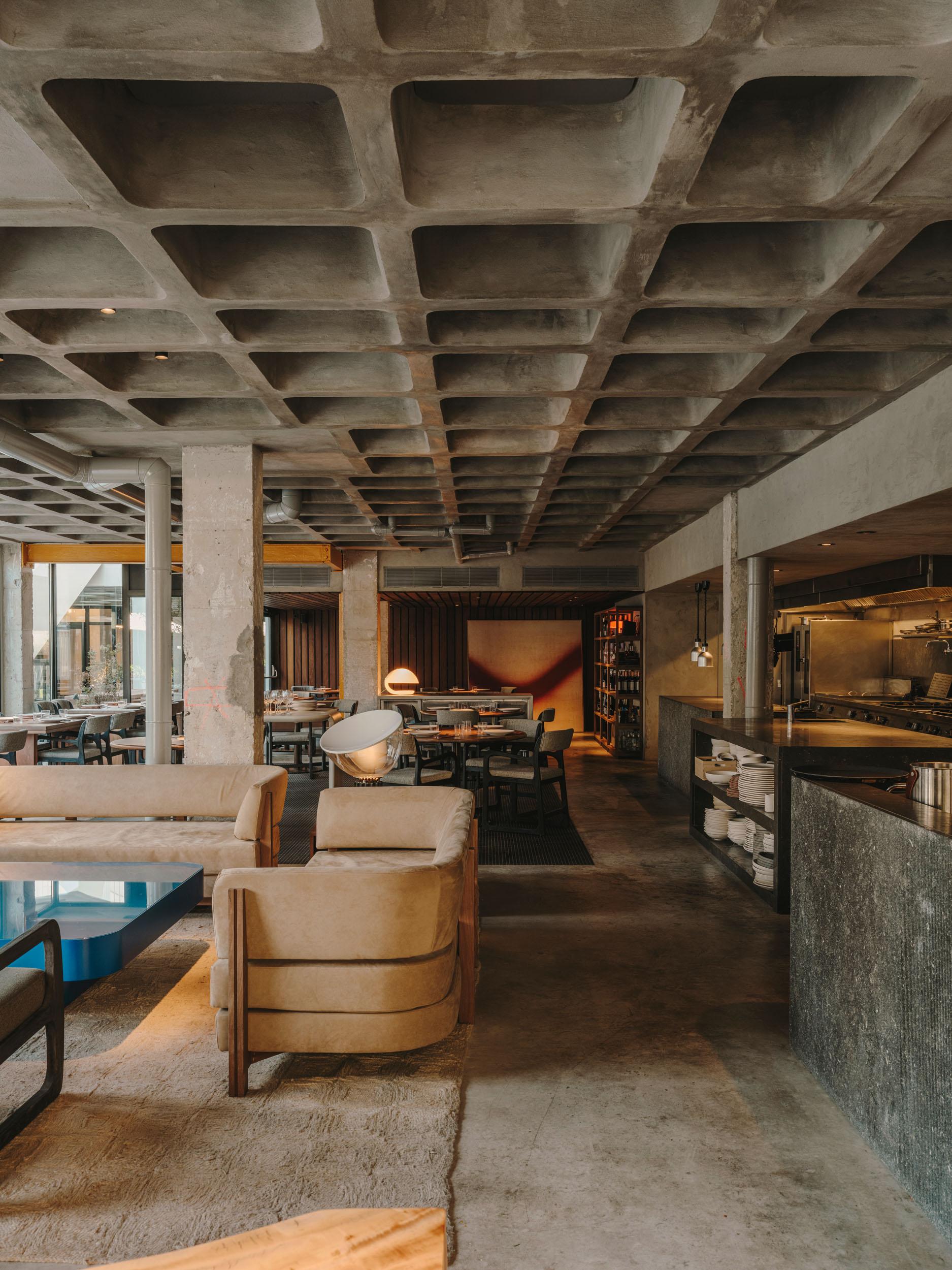 One of the most striking elements of the room is the impressive custom-made suede sofa crafted entirely by Marcasal.This wooden-framed sofa was exclusively designed by Sandra Taruella for the restaurant, perfectly fitting the industrial yet cozy style of the space. The suede upholstery,besides offering asoft and luxurious texture,adds a touch of sophistication and warmth that contrasts with the concrete and metal finishes of the surroundings. The design of the sofa, with its clean lines and robust shapes, is not only aesthetically pleasing but also provides comfort and elegance, making it a central piece in the restaurant’s seating area. The choice of materials, a collaborative effort with the interior designer, and the care in its craftsmanship reflect the attention to detail and quality that Marcasal brings to each of its projects.