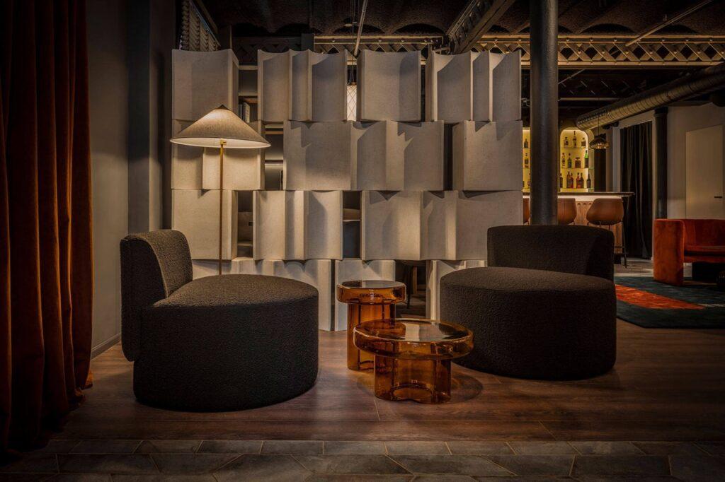 Marcasal ha utilizado una combinación de textiles de terciopelo en algunas butacas y otros textiles para otras, destacando la técnica de tapizado capitoné. Los sofás, por su diseño curvado, requieren una técnica de tapizado más compleja, logrando acabados perfectos. Tanto las butacas como los sofás presentan curvas y formas redondeadas, contribuyendo a la armonía estética del espacio.
