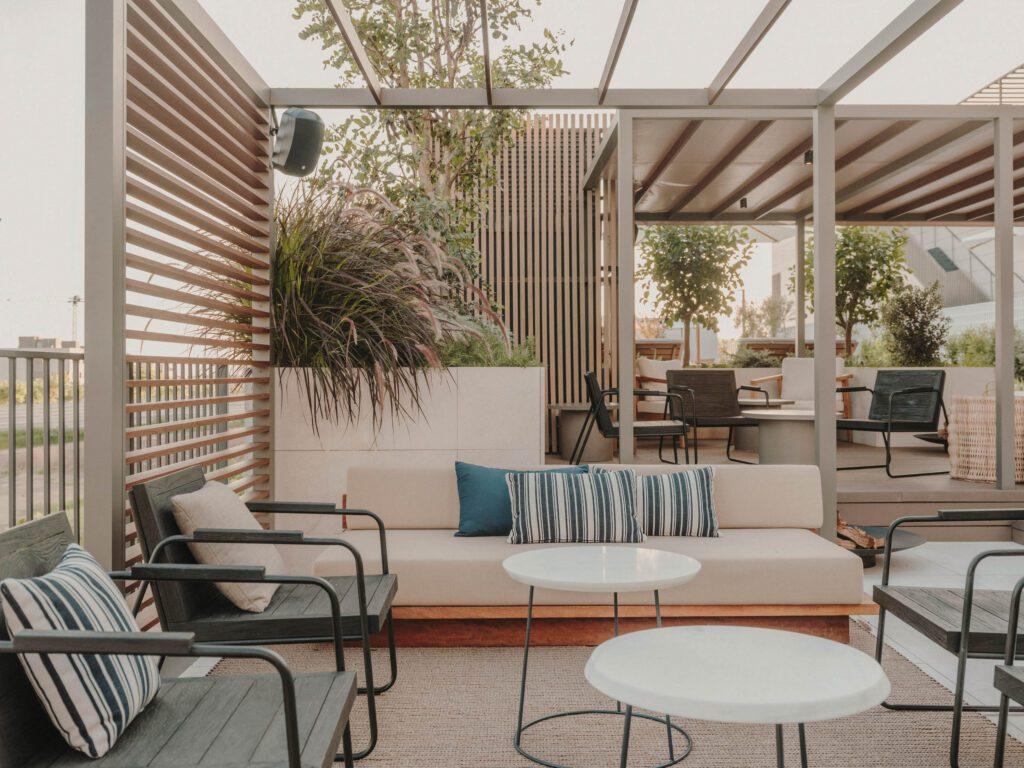 En las terrazas, los sofás de iroco diseñados por Marcasal se destacan por su durabilidad y estilo. La tapicería, resistente a las condiciones exteriores, mantiene una paleta de colores terrosos que complementa la belleza natural del entorno marino, y las colchonetas de los bancos invitan al relax con su comodidad y diseño pensado para la convivencia al aire libre.